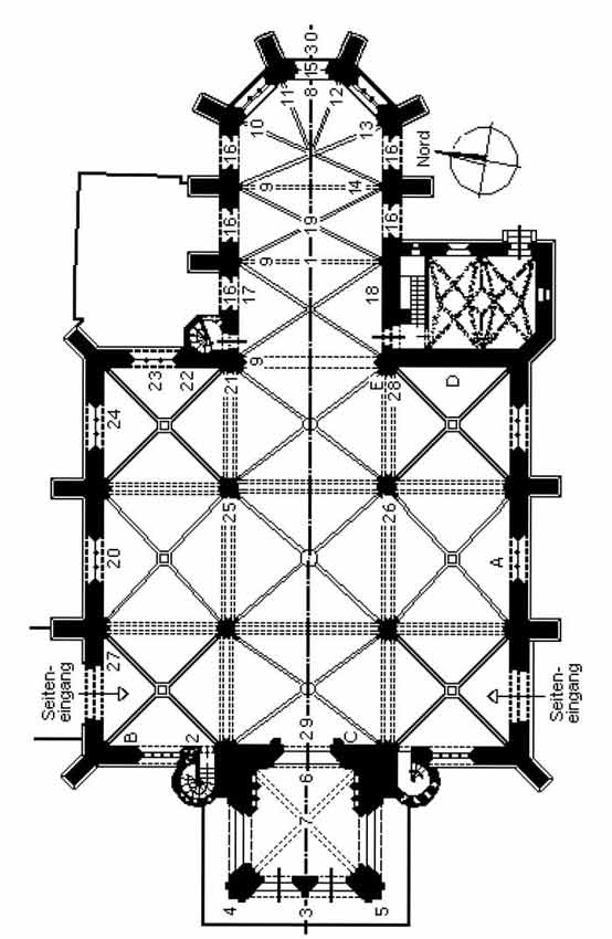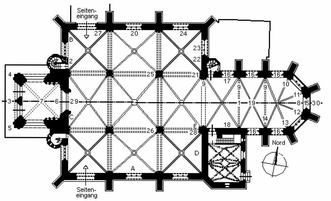Legende: 1.Tucheraltar,  2.Strahlenkranzmadonna, 3.Verkündigungsengel, 4.Edith Stein, 5.Klais-Orgel, 6.Epitaph des königlichen Küchenmeisters, 7.Die Vorhalle, 8.Michaelschor mit Empore, 9.Pergenstorffer Epitaph, 10.Die Heilige Sippe, 11.Rebeck`sches Epitaph, 12.Verkündigungsgruppe, 13.Auferstehungsepitaph
